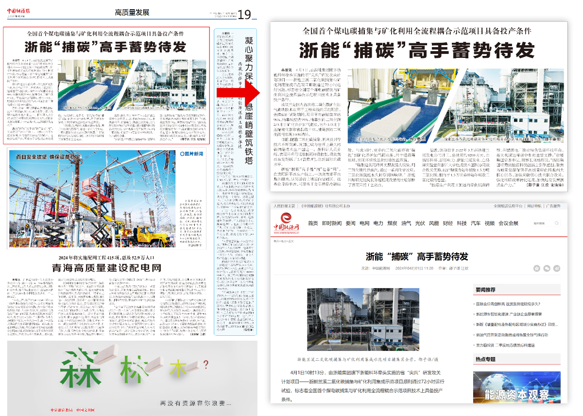 4月8日,人民日報(bào)旗下《中國能源報(bào)》版面頭條《浙能“捕碳”高手蓄勢待發(fā)》。 中國能源報(bào) 圖