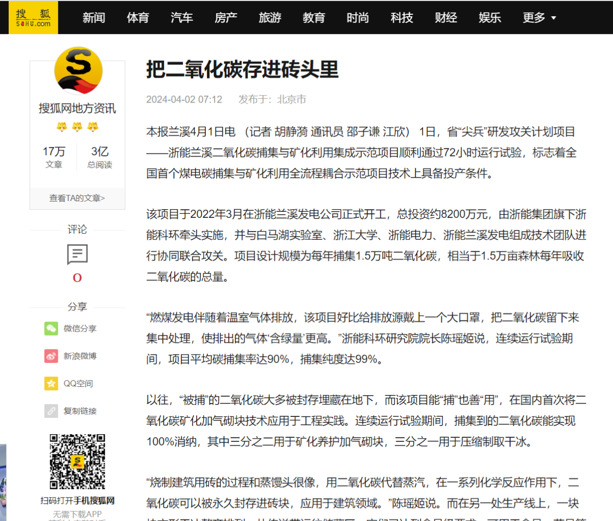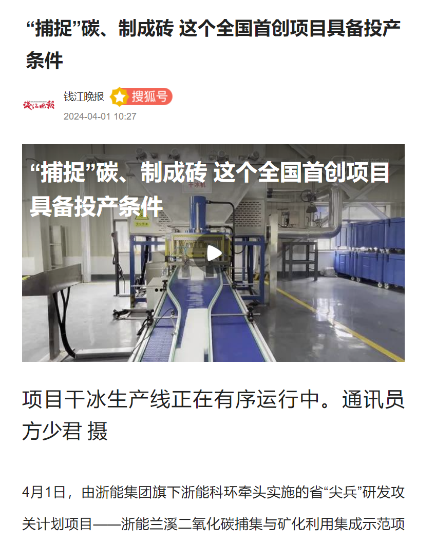 4月1日,錢江晚報(bào)搜狐號轉(zhuǎn)載報(bào)道《“捕捉”碳、制成磚 這個全國首創(chuàng)項(xiàng)目具備投產(chǎn)條件》。 錢江晚報(bào)搜狐號 圖