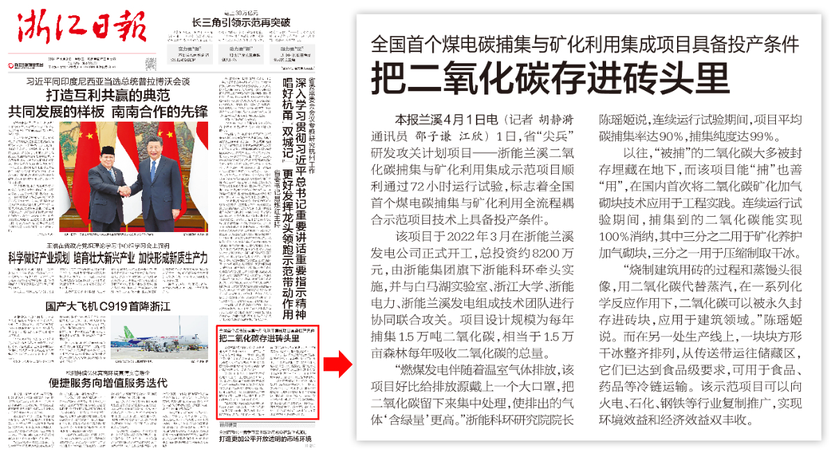 4月2日,《浙江日報(bào)》頭版刊登浙能新聞《全國首個煤電碳捕集與礦化利用集成項(xiàng)目具備投產(chǎn)條件 把二氧化碳存進(jìn)磚頭里》。 浙江日報(bào) 圖