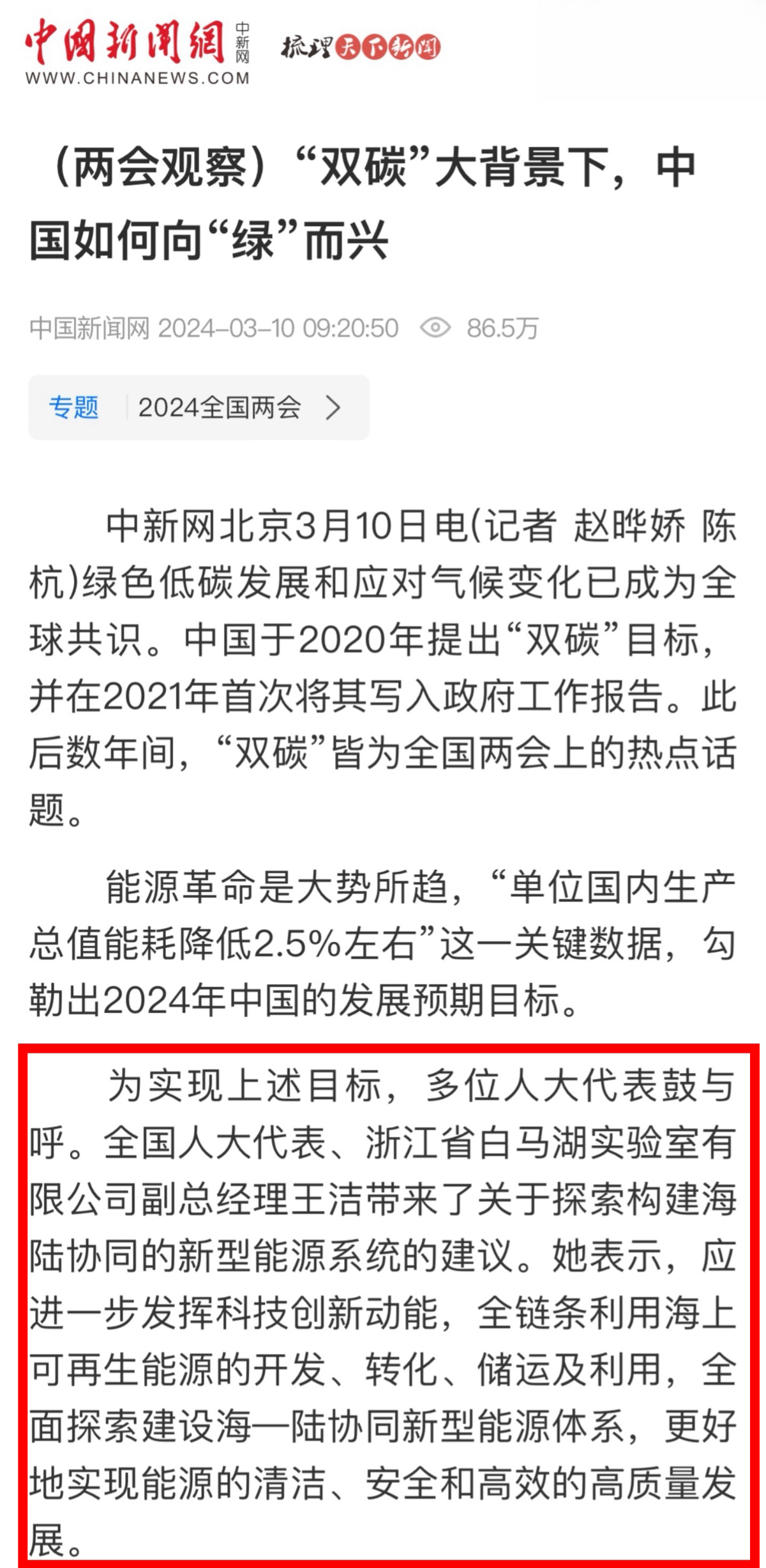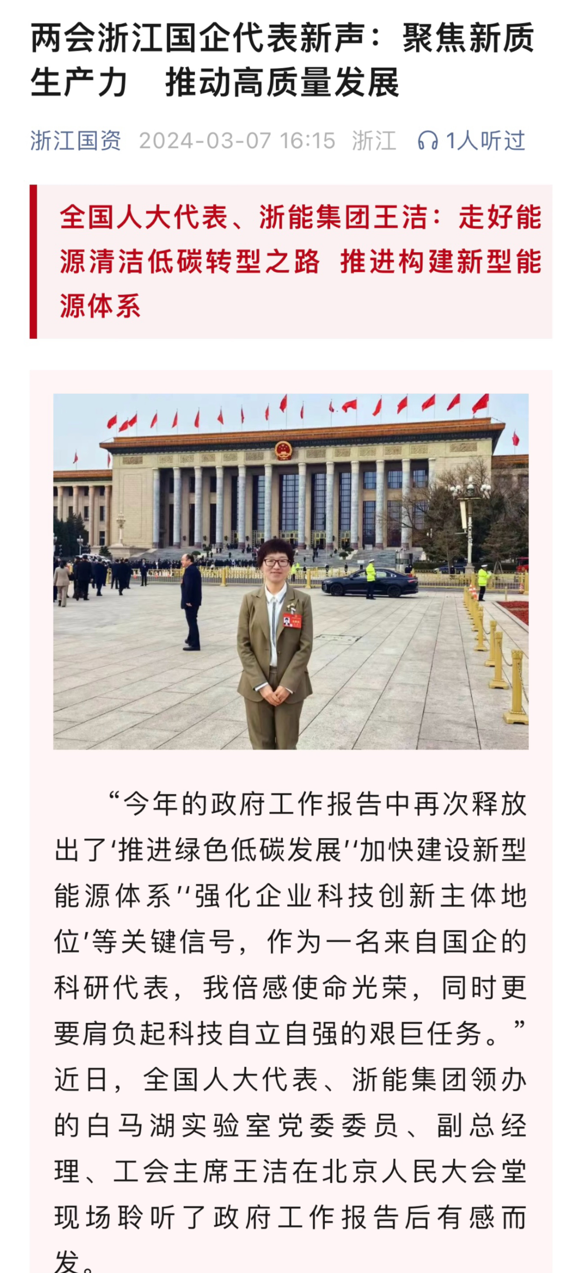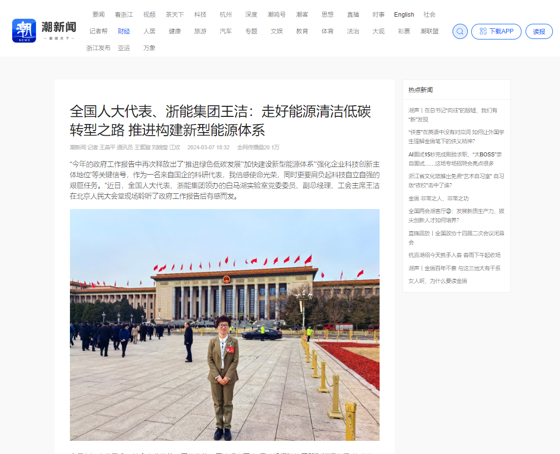 潮新聞客戶(hù)端報(bào)道《全國(guó)人大代表、浙能集團(tuán)王潔:走好能源清潔低碳轉(zhuǎn)型之路 推進(jìn)構(gòu)建新型能源體系》。 潮新聞客戶(hù)端 圖