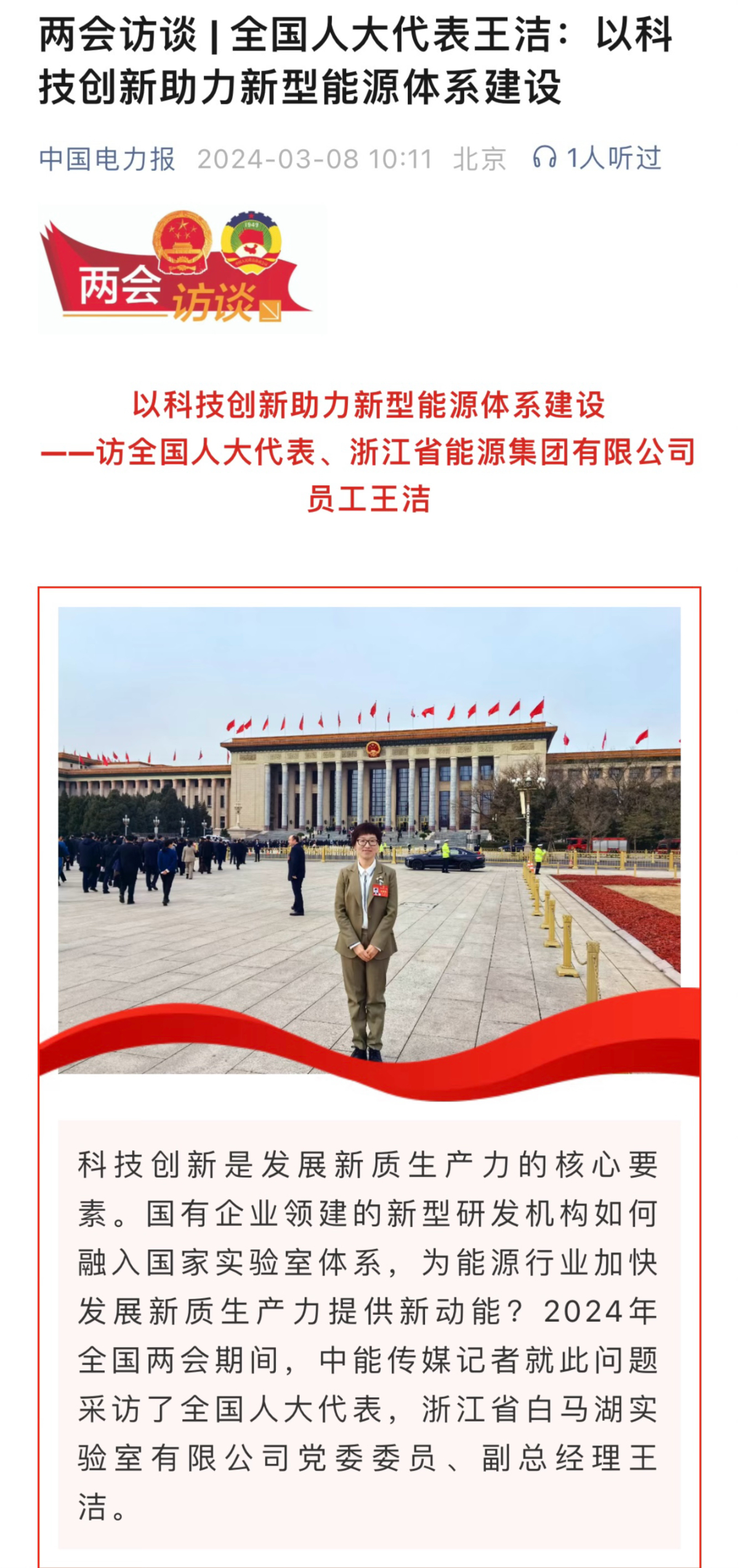中國(guó)電力報(bào)報(bào)道《兩會(huì)訪(fǎng)談 | 全國(guó)人大代表王潔:以科技創(chuàng)新助力新型能源體系建設(shè)》。 中國(guó)電力報(bào) 圖