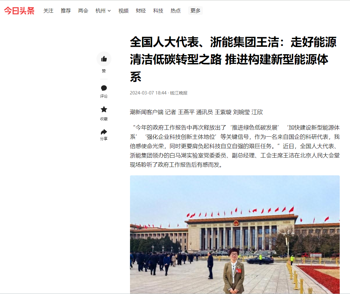 今日頭條報(bào)道《全國(guó)人大代表、浙能集團(tuán)王潔:走好能源清潔低碳轉(zhuǎn)型之路 推進(jìn)構(gòu)建新型能源體系》。 今日頭條 圖