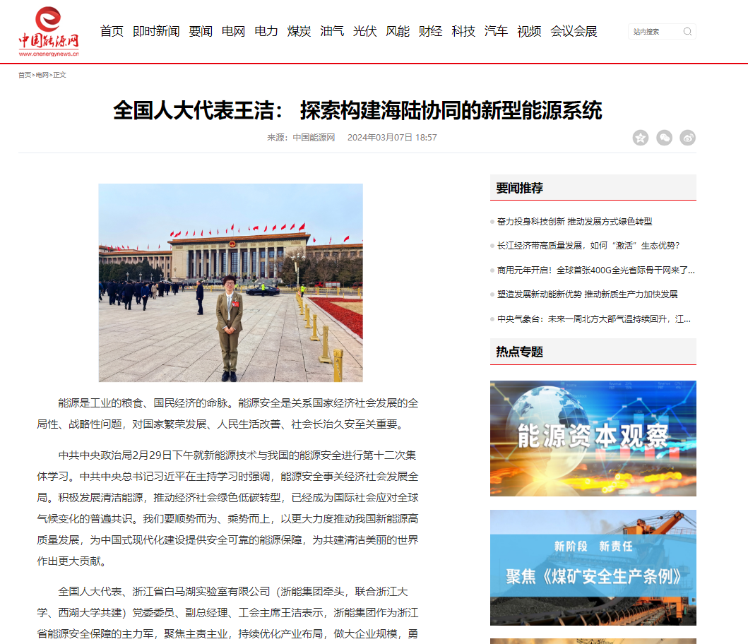 人民日?qǐng)?bào)海外版官網(wǎng)報(bào)道《全國(guó)人大代表王潔:探索構(gòu)建海陸協(xié)同的新型能源系統(tǒng)》。 人民日?qǐng)?bào)海外版官網(wǎng) 圖