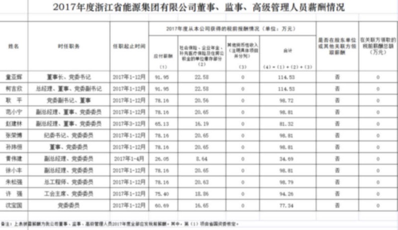2017年度浙江省能源集團有限公司董事、監(jiān)事、高級管理人員薪酬情況
